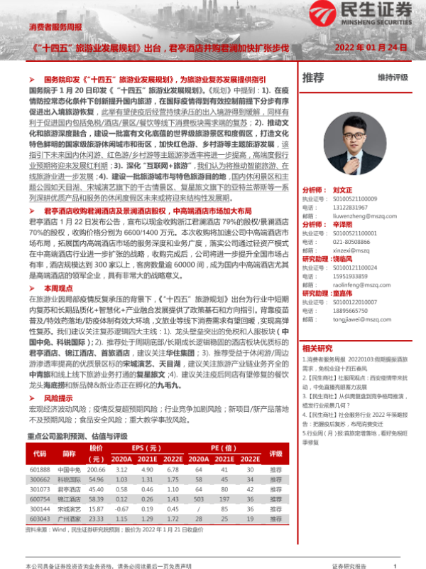【民生证券】【20220124】消费者服务周报:《“十四五”旅游业发展规划》出台,君亭酒店并购君澜加快扩张步伐-36页 行业研究