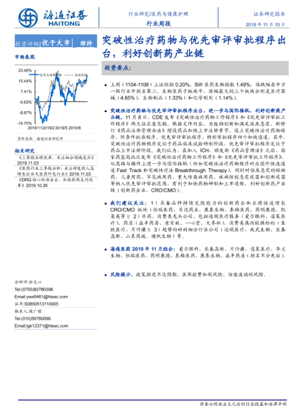 【海通证券】【20191110】医药与健康护理行业周报:突破性治疗药物与优先审评审批程序出台,利好创新药产业链-5页 行业研究