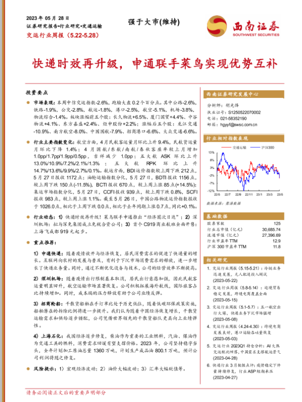 【西南证券】【20230528】交运行业周报:快递时效再升级,申通联手菜鸟实现优势互补-19页 行业研究
