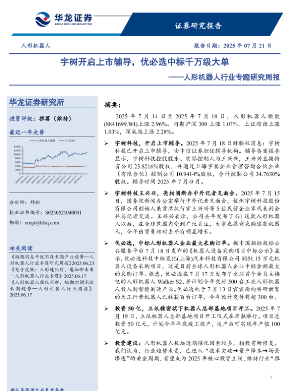 【华龙证券】【20250721】人形机器人行业专题研究周报:宇树开启上市辅导,优必选中标千万级大单-10页 行业研究