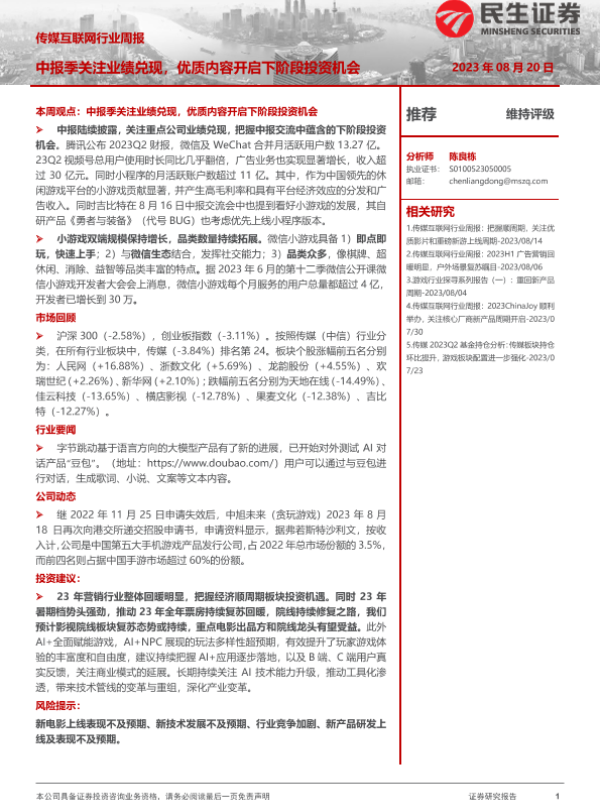 【民生证券】【20230820】传媒互联网行业周报:中报季关注业绩兑现,优质内容开启下阶段投资机会-16页 行业研究