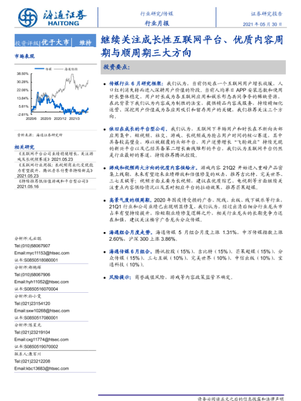 【海通证券】【20210530】20210530-海通证券-传媒行业月报:继续关注成长性互联网平台、优质内容周期与顺周期三大方向-11页 行业研究
