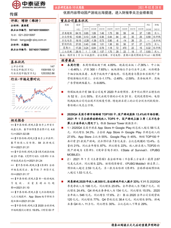 【中泰证券】【20210228】20210228-中泰证券-传媒行业周报:优质内容带动国产游戏出海提速,进入财报季关注业绩表现-16页 行业研究