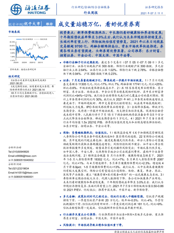 【海通证券】【20210711】综合金融服务行业周报:成交量站稳万亿,看好优质券商-10页 行业研究