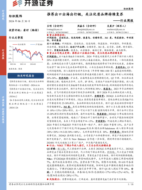 【开源证券】【20240630】纺织服饰行业周报:推荐出口出海出行链,关注优质品牌持续复苏-18页 行业研究