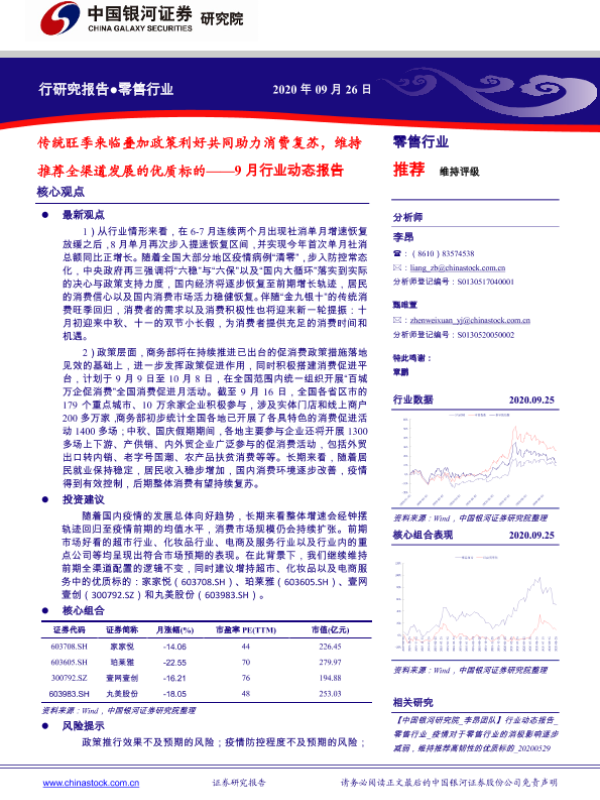 【银河证券】【20200926】零售9月行业动态报告:传统旺季来临叠加政策利好共同助力消费复苏-30页 行业研究