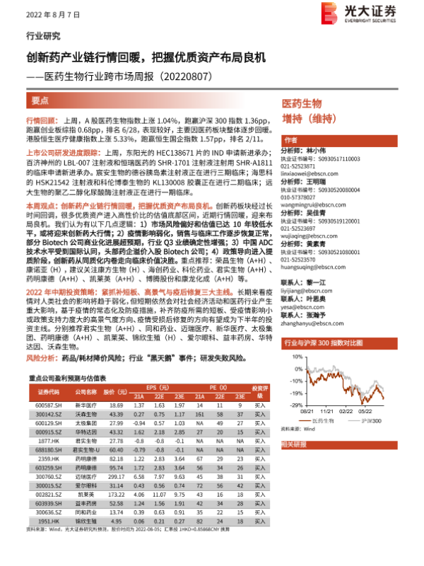 【光大证券】【20220807】医药生物行业跨市场周报:创新药产业链行情回暖,把握优质资产布局良机-23页 行业研究
