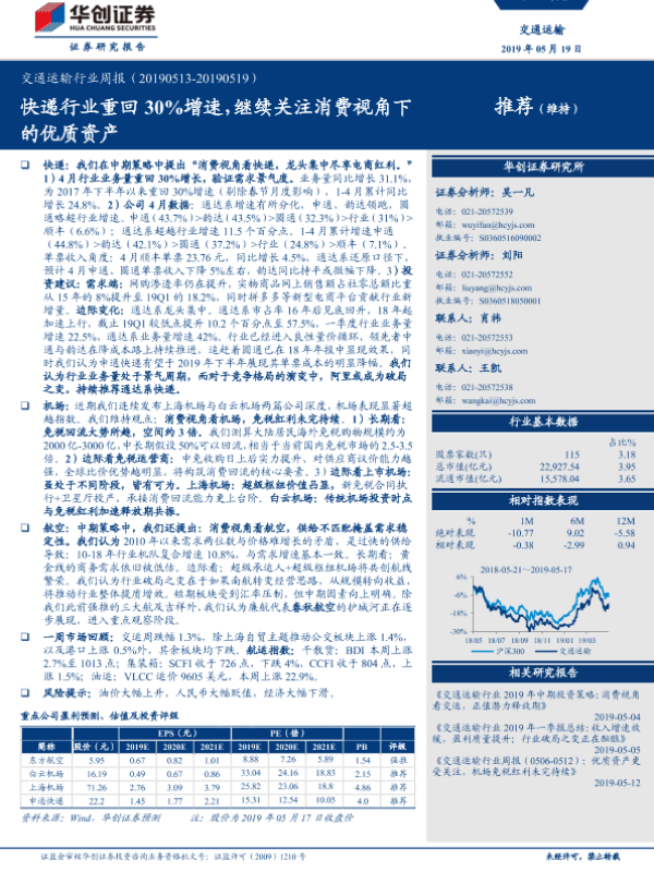【华创证券】【20190519】交通运输行业周报:快递行业重回30%增速,继续关注消费视角下的优质资产-12页 行业研究