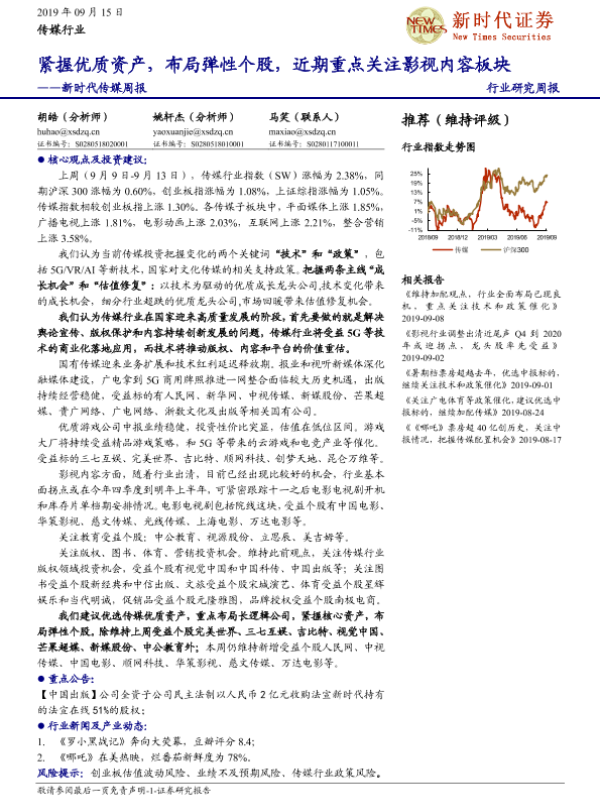 【新时代证券】【20190915】新时代传媒周报:紧握优质资产,布局弹性个股,近期重点关注影视内容板块-12页 行业研究