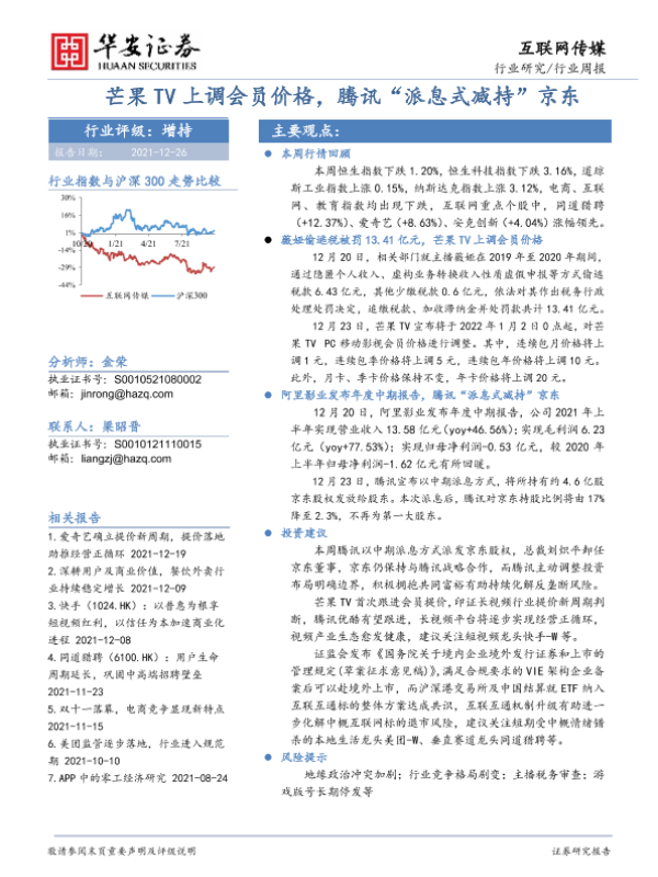 【华安证券】【20211226】20211226-华安证券-互联网传媒行业周报:芒果TV上调会员价格,腾讯“派息式减持”京东-18页 行业研究