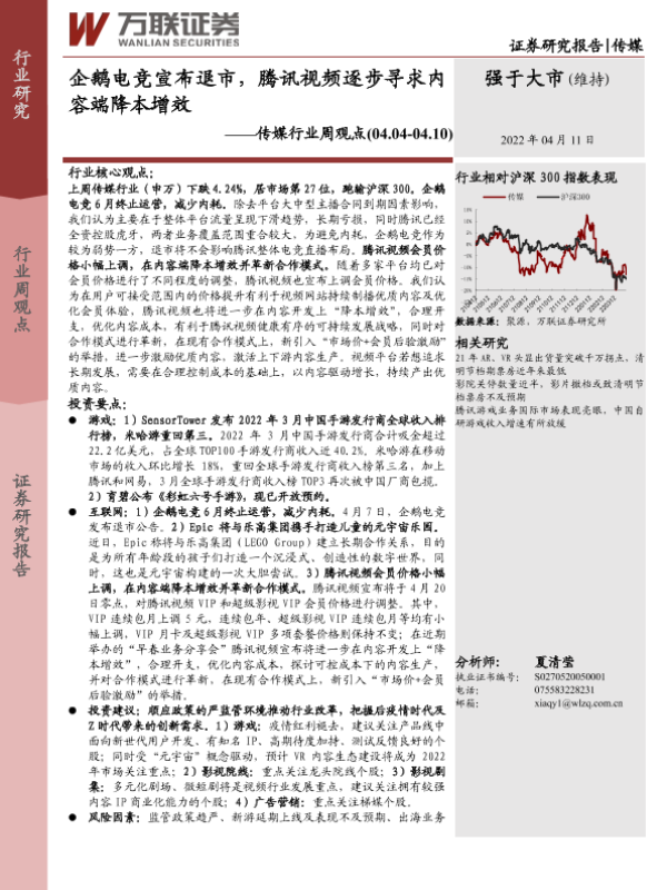 【万联证券】【20220411】企鹅电竞宣布退市,腾讯视频逐步寻求内容端降本增效-13页 行业研究