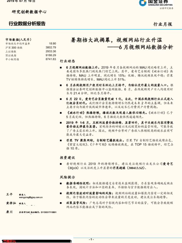 【国金证券】【20190719】6月视频网站数据分析:暑期档大战揭幕,视频网站行业升温-18页 行业研究