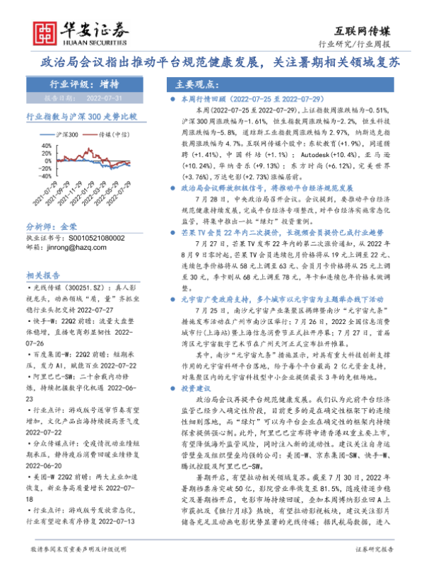 【华安证券】【20220731】互联网传媒行业周报:政治局会议指出推动平台规范健康发展,关注暑期相关领域复苏-22页 行业研究