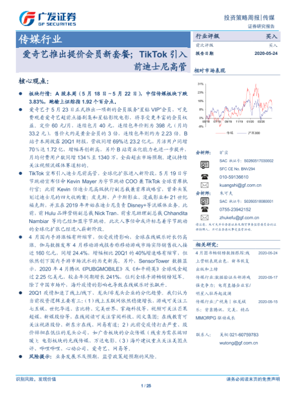 【广发证券】【20200524】20200524-广发证券-传媒行业投资策略周报:爱奇艺推出提价会员新套餐;TikTok引入前迪士尼高管-25页 行业研究