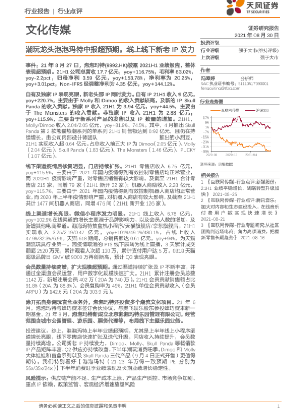 【天风证券】【20210830】潮玩龙头泡泡玛特中报超预期,线上线下新老IP发力-19页 行业研究