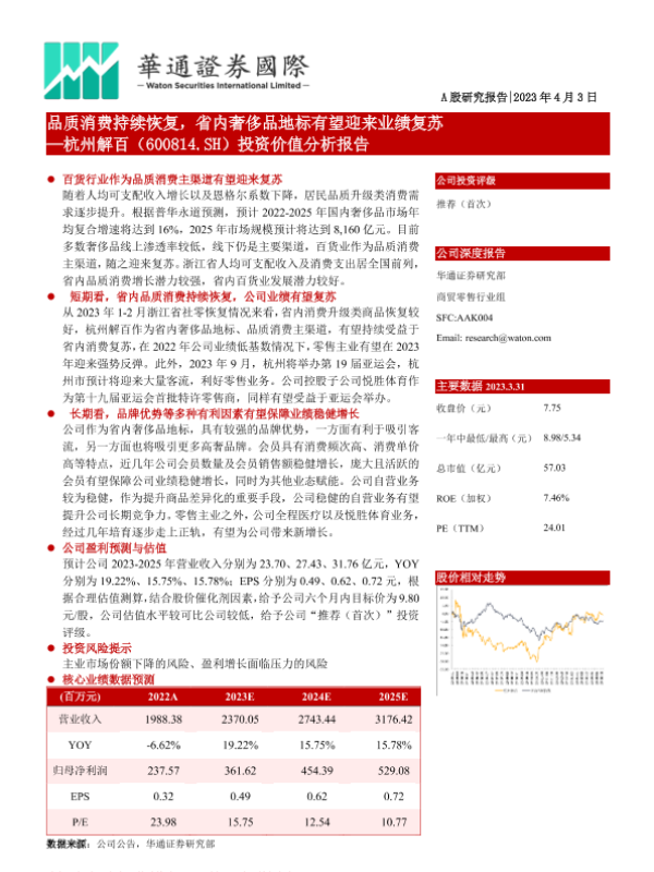 【华通证券国际】【20230403】品质消费持续恢复,省内奢侈品地标有望迎来业绩复苏 —杭州解百(600814.SH)投资价值分析报告-22页 行业研究