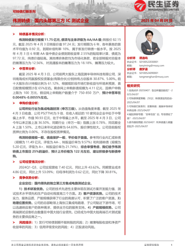 【民生证券】【20250408】可转债打新系列:伟测转债-15页 证券期货研究报告