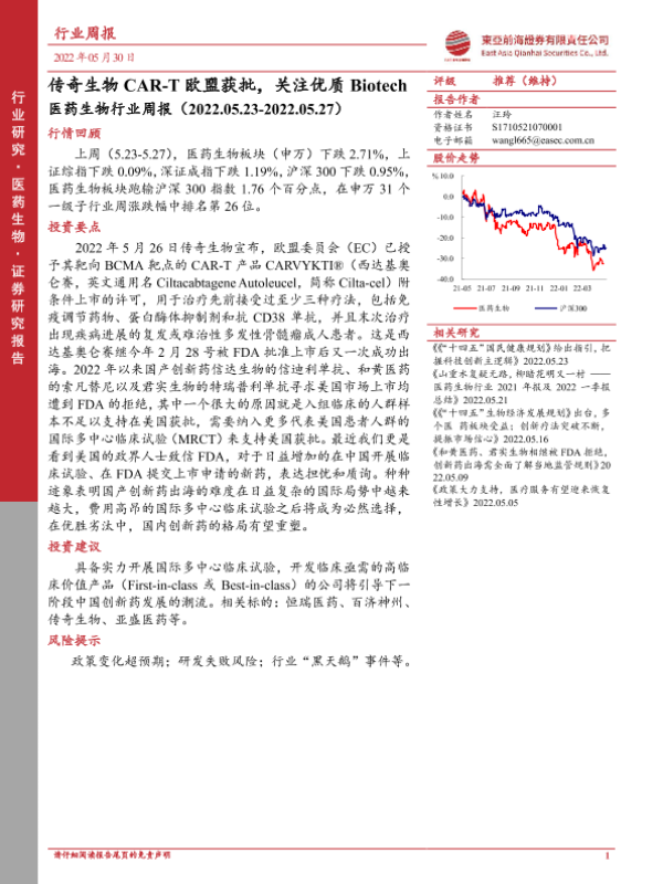 【东亚前海证券】【20220530】医药生物行业周报:传奇生物CAR-T欧盟获批,关注优质Biotech-12页 行业研究