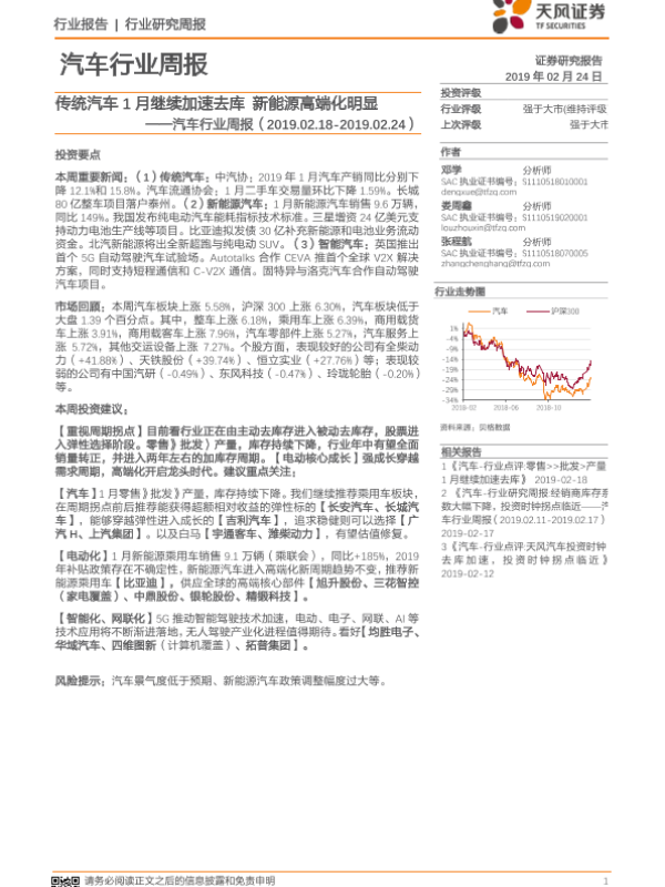 【天风证券】【20190224】20190224-天风证券-汽车行业周报:传统汽车1月继续加速去库 新能源高端化明显-24页 行业研究