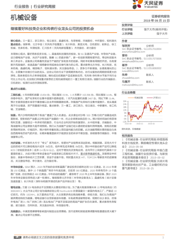 【天风证券】【20190915】20190915-天风证券-机械设备行业研究周报:继续看好科技类企业和传统行业龙头公司的投资机会-19页 行业研究