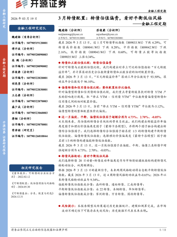 【开源证券】【202603】3月转债配置:转债估值偏贵,看好平衡低估风格——金融工程定期-11页 证券期货研究报告