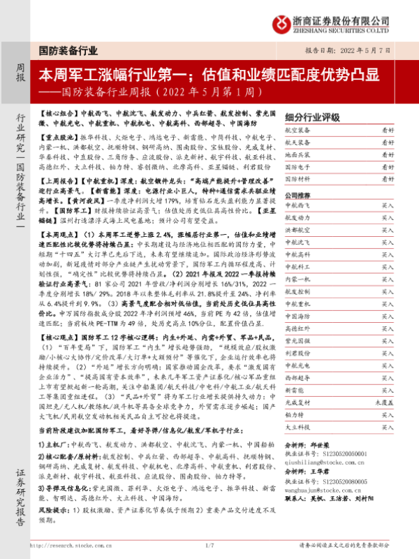 【浙商证券】【20220507】国防装备行业周报(2022年5月第1周):本周军工涨幅行业第一;估值和业绩匹配度优势凸显-7页 行业研究