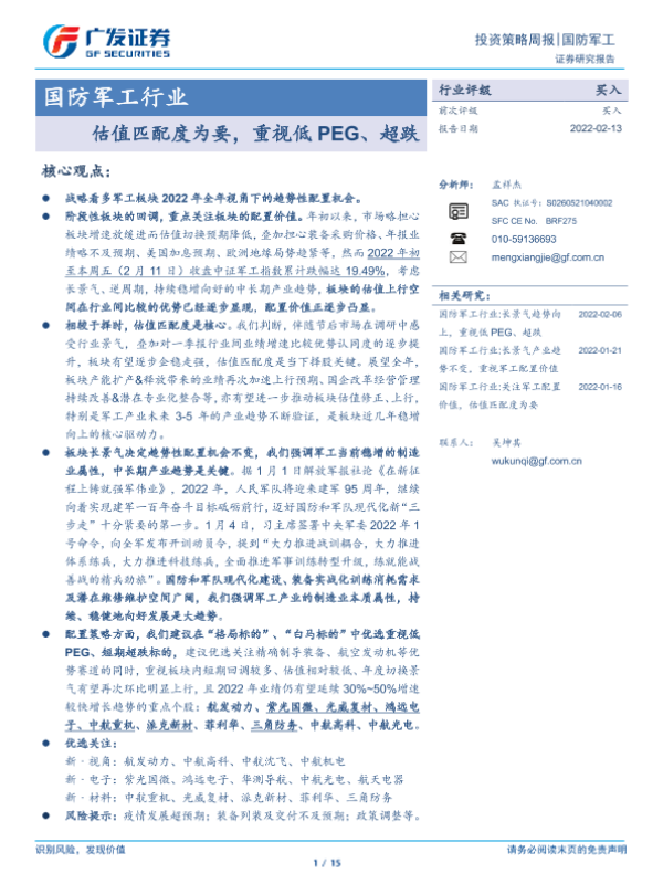 【广发证券】【20220213】国防军工行业:估值匹配度为要,重视低PEG、超跌-15页 行业研究