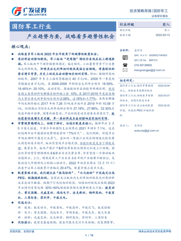 【广发证券】【20220313】国防军工行业:产业趋势为要,战略看多趋势性机会-15页 行业研究