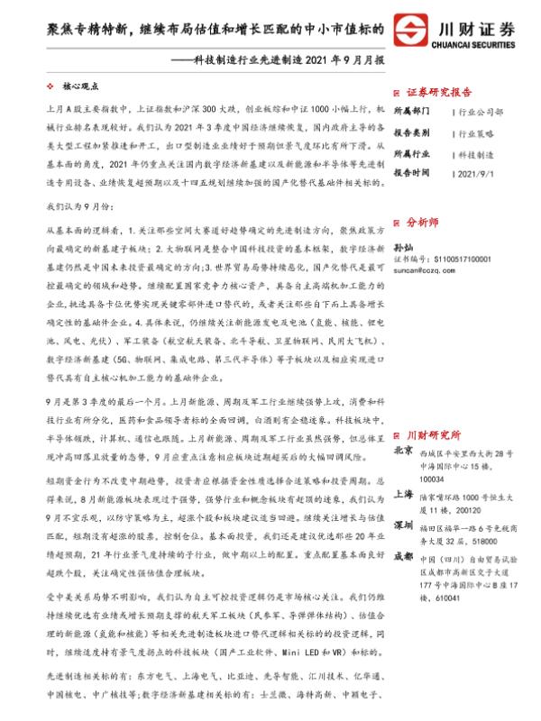 【川财证券】【20210901】科技制造行业先进制造2021年9月月报:聚焦专精特新,继续布局估值和增长匹配的中小市值标的-14页 行业研究