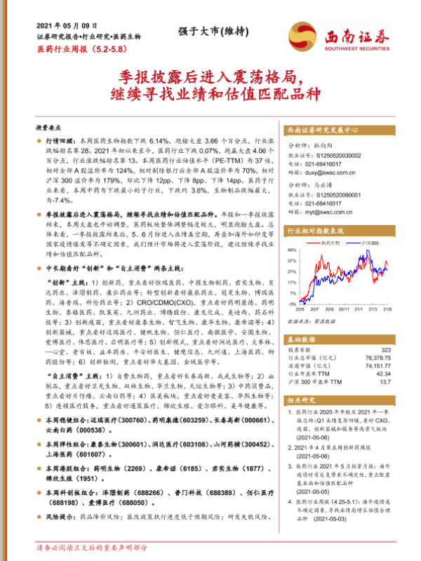 【西南证券】【20210509】医药行业周报:季报披露后进入震荡格局,继续寻找业绩和估值匹配品种-39页 行业研究