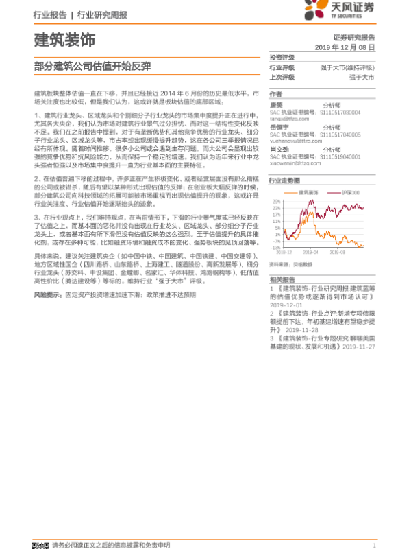 【天风证券】【20191208】建筑装饰行业研究周报:部分建筑公司估值开始反弹-2页 行业研究