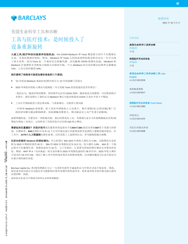 【巴克莱】【20211005】美股医疗保健行业工具vs.医疗技术:是时候让设备重回正轨了-33页 行业研究