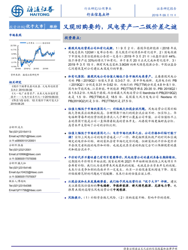 【海通证券】【20190911】公用事业行业信息点评:又现回购要约,风电资产一二级价差之谜-2页 行业研究