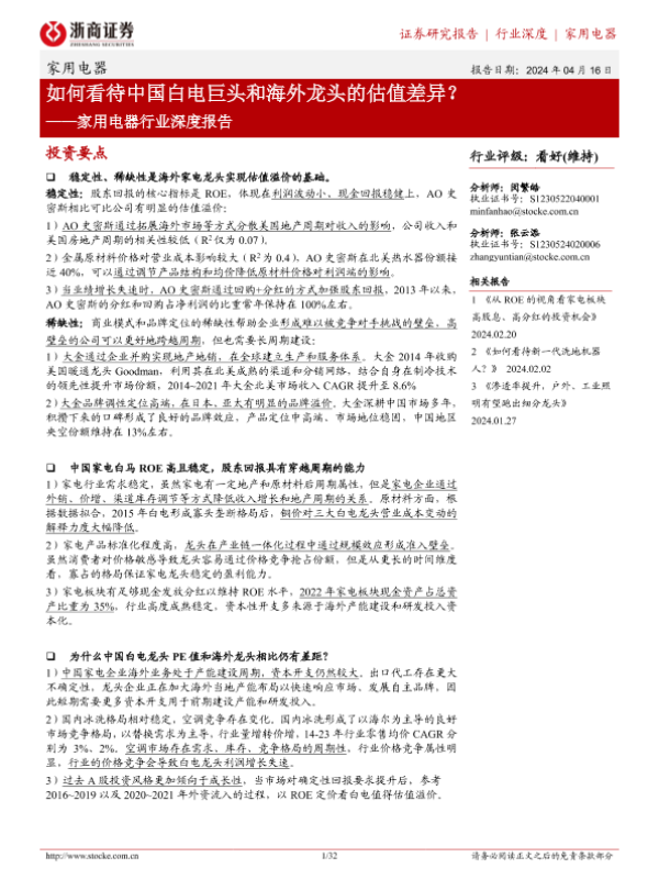 【浙商证券】【20240416】如何看待中国白电巨头和海外龙头的估值差异?-32页 行业研究