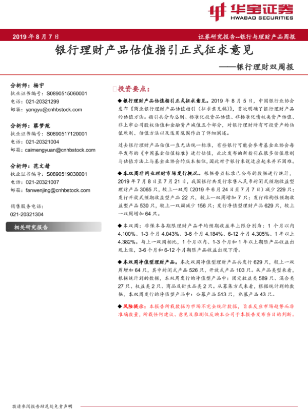 【华宝证券】【20190807】银行理财产品估值指引正式征求意见-14页 行业研究