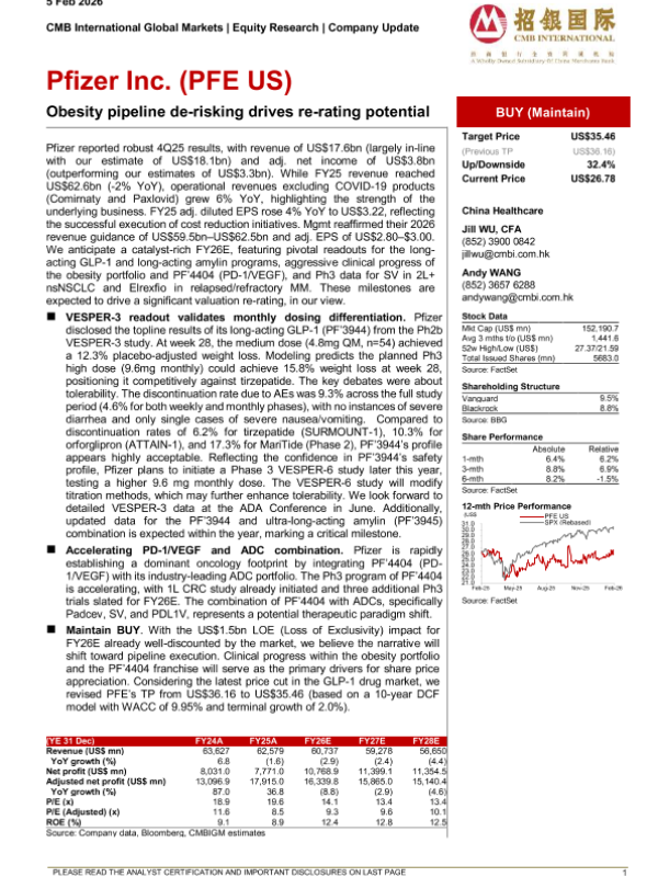 【CMB International Global Markets】【202602】Pfizer Inc.(PFE US)- Obesity pipeline de-risking drives re-rating potential-5页 证券期货研究报告