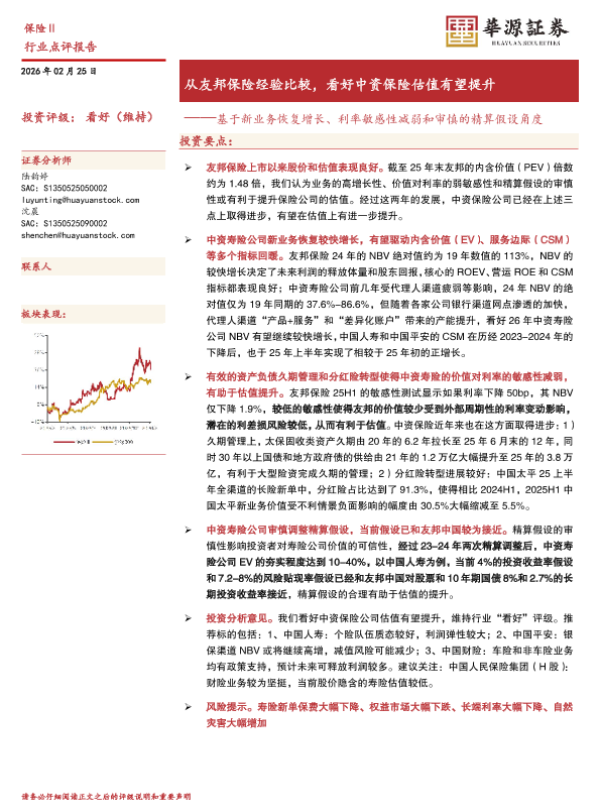 【华源证券】【2025】从友邦保险经验比较,看好中资保险估值有望提升:基于新业务恢复增长、利率敏感性减弱和审慎的精算假设角度-8页 证券期货研究报告
