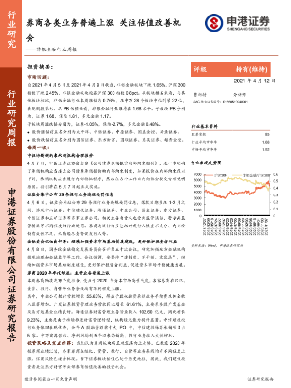 【申港证券】【20210412】非银金融行业周报:券商各类业务普遍上涨 关注估值改善机会-13页 行业研究