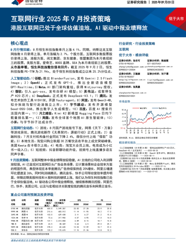 【国信证券】【202509】优于大市 互联网行业 2025年 9月投资策略-18页 证券期货研究报告
