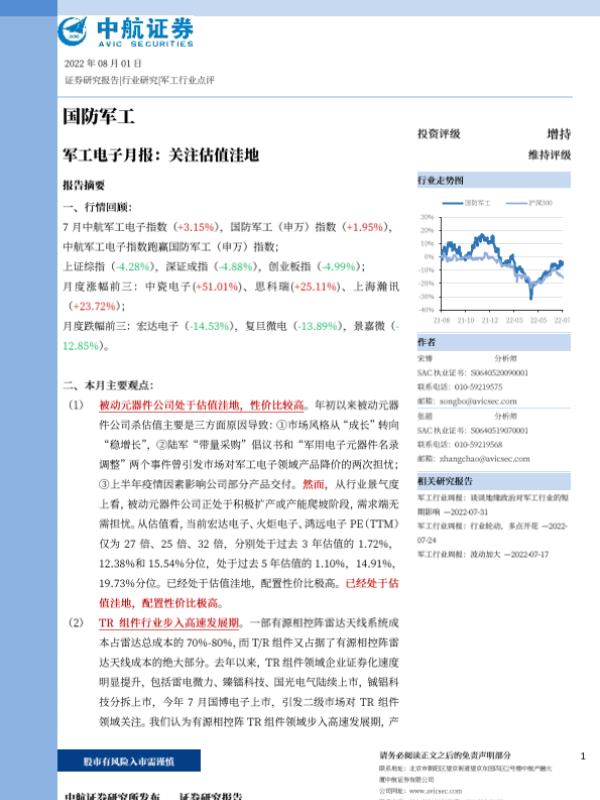 【中航证券】【20220801】军工电子月报:关注估值洼地-23页 行业研究