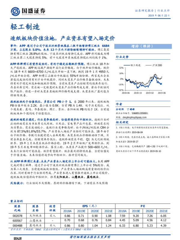 【国盛证券】【20190622】轻工制造行业点评:造纸板块价值洼地,产业资本有望入场定价-2页 行业研究