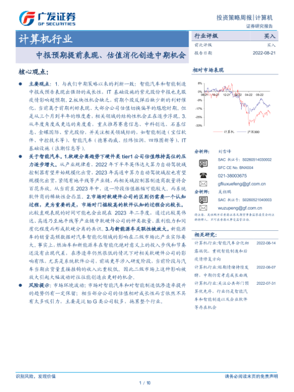 【广发证券】【20220821】计算机行业:中报预期提前表现、估值消化创造中期机会-10页 行业研究