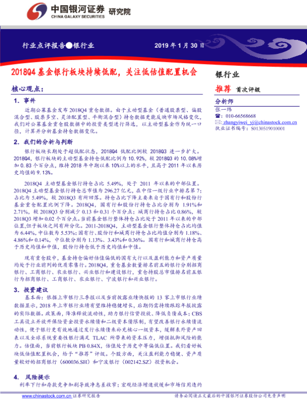 【银河证券】【20190130】2018Q4受9月基金银行板块持续低配,关注低估值配置机会-8页 行业研究