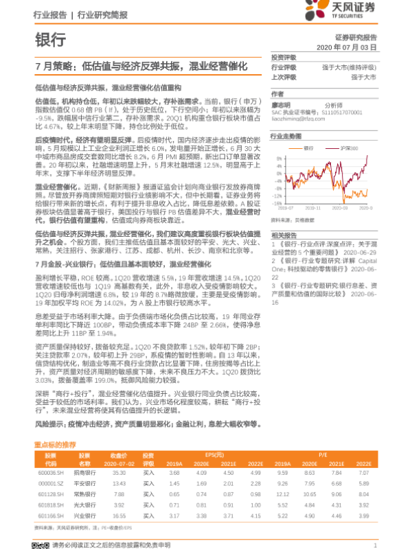 【天风证券】【20200703】银行7月策略:低估值与经济反弹共振,混业经营催化-5页 行业研究