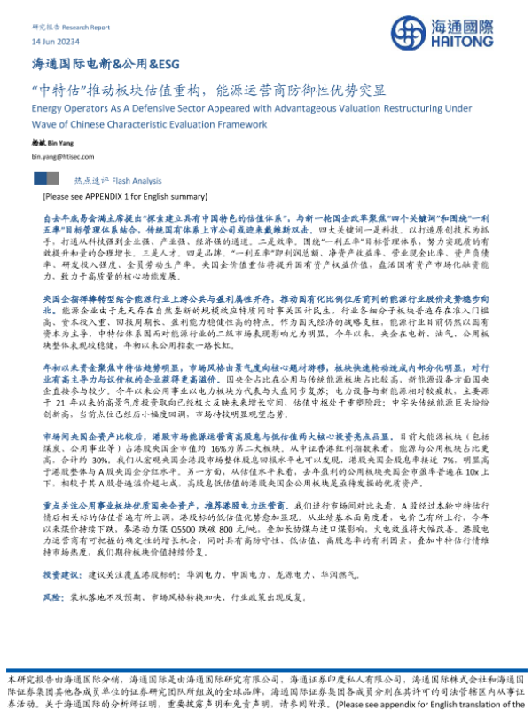 【海通国际】【20230614】电新&公用&ESG:“中特估”推动板块估值重构,能源运营商防御性优势突显-13页 行业研究
