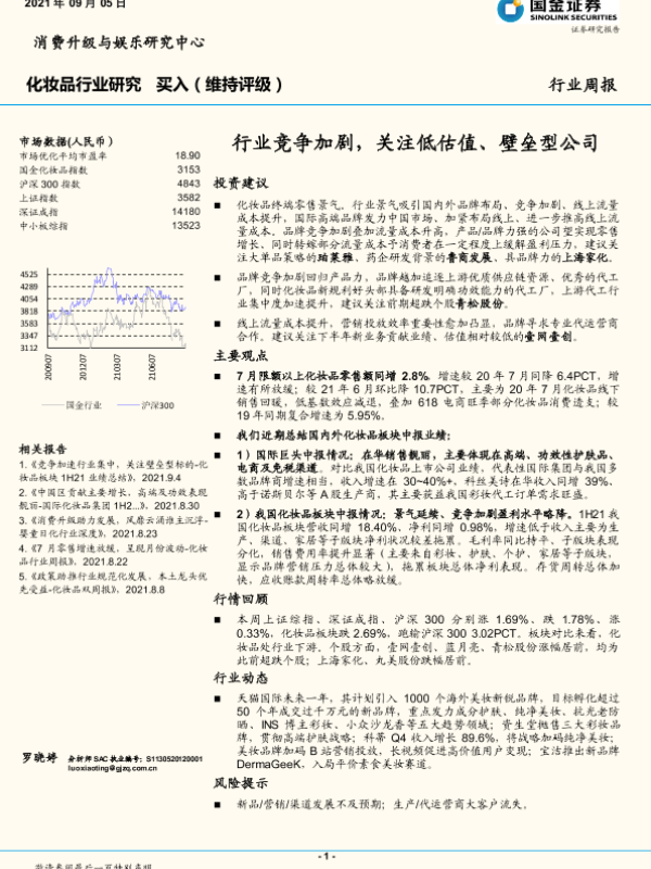 【国金证券】【20210905】化妆品行业研究周报:行业竞争加剧,关注低估值、壁垒型公司-9页 行业研究