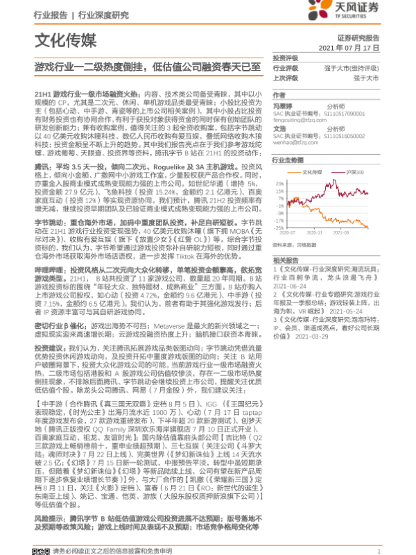 【天风证券】【20210717】文化传媒行业:游戏行业一二级热度倒挂,低估值公司融资春天已至-16页 行业研究