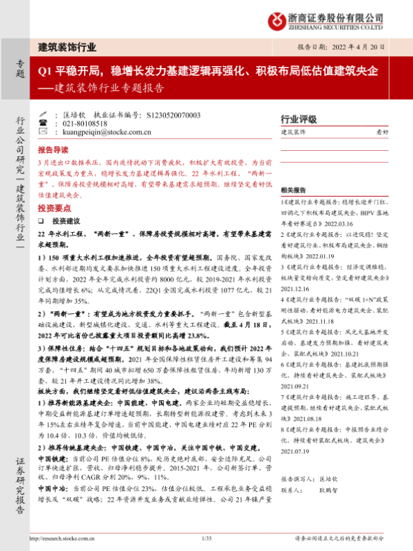 【浙商证券】【20220420】建筑装饰行业专题报告:Q1平稳开局,稳增长发力基建逻辑再强化、积极布局低估值建筑央企-35页 行业研究