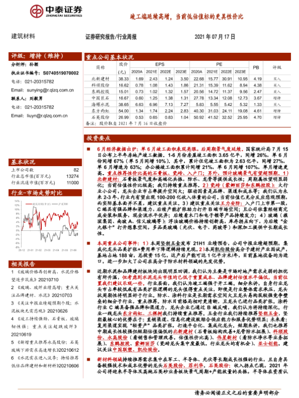 【中泰证券】【20210717】建筑材料行业周报:竣工端延续高增,当前低估值标的更具性价比-25页 行业研究