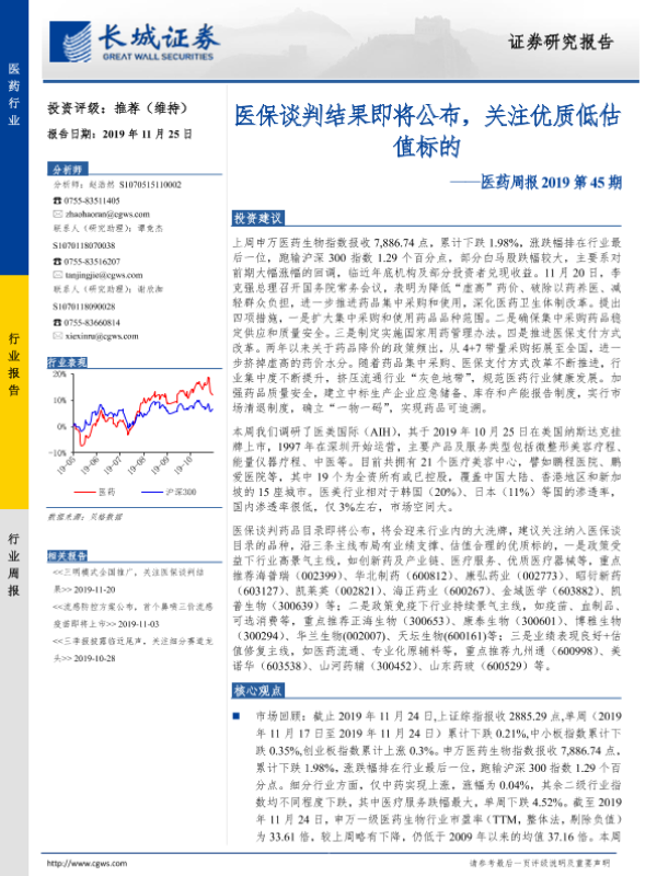 【长城证券】【20191125】医药周报2019第45期:医保谈判结果即将公布,关注优质低估值标的-16页 行业研究
